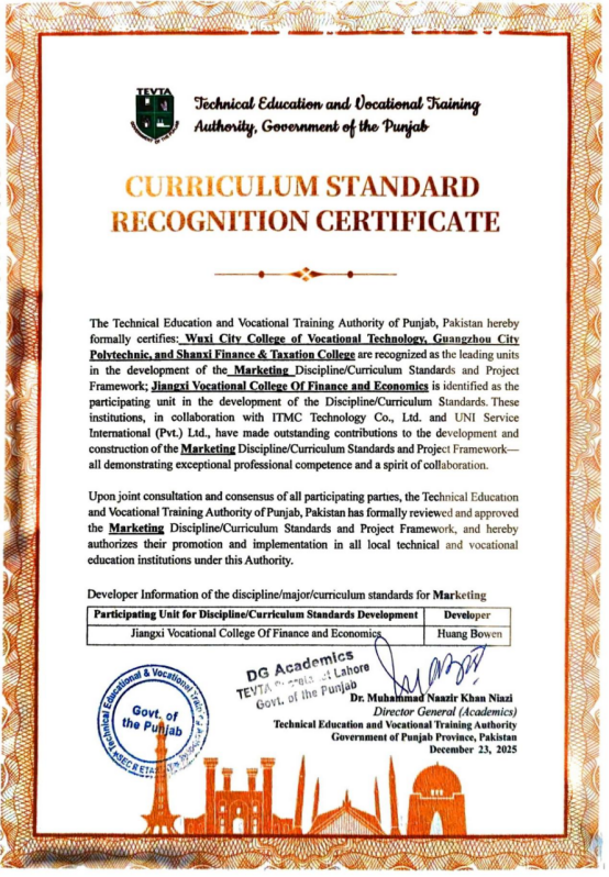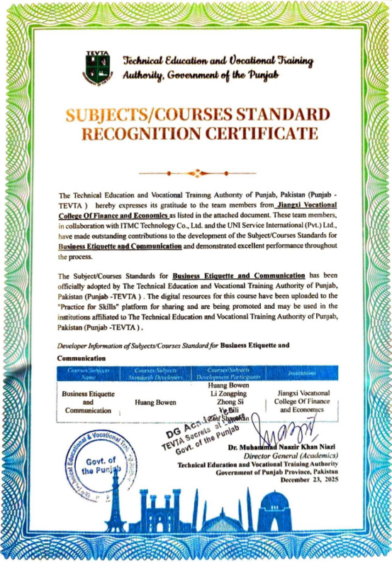近日,由工商管理学院参与开发的“市场营销专业标准”及主持编制的《商务礼仪与沟通》课程标准,先后通过巴基斯坦旁遮普省技术教育与职业培训局(TEVTA)的官方审核与认证,并获得在该省职业教育体系内的全面推广授权。