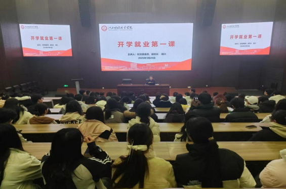 3月26日,校党委委员、副校长胡兴在八里湖校区行政楼二号报告厅为学生讲授“开学就业第一课”,工商管理学院、财税金融学院、基础教育学院200余名师生参加。
